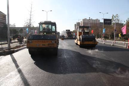 為保證質(zhì)量,確保工期,我公司充分發(fā)揮機(jī)械化施工優(yōu)勢,采用3臺(tái)大型銑刨機(jī)同時(shí)作業(yè),僅用2個(gè)晚上就完成了新石北路以北700米快慢車道的銑刨任務(wù)。同時(shí),由于該工程是冬季施工,為防止嚴(yán)寒低溫天氣對工程質(zhì)量造成影響,公司采用了RH溫拌改性瀝青工藝,這是我市首次采用這一工藝。該工藝通過使用RH溫拌改性劑材料制備溫拌瀝青,在不降低混合料性能的情況下,有效保證了低溫環(huán)境下瀝青混凝土攤鋪質(zhì)量。